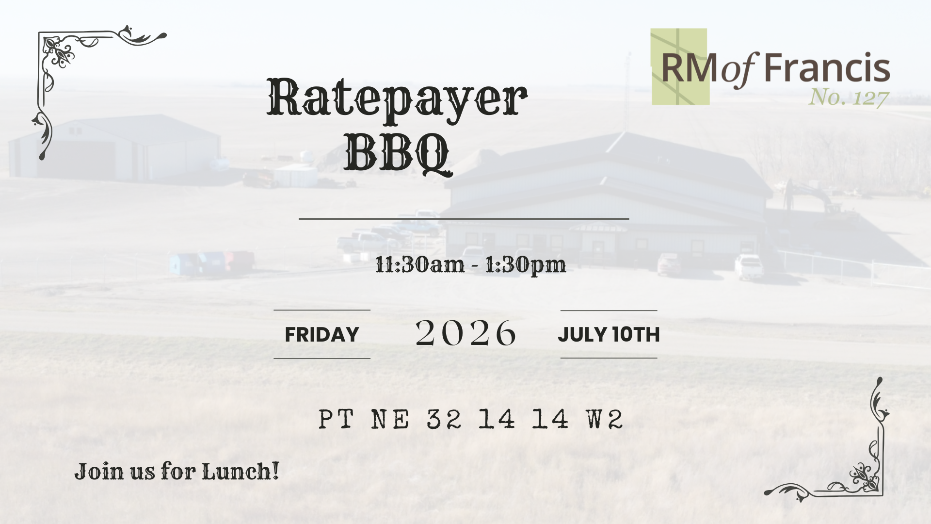 Save the date: Ratepayer BBQ – July 10, 2026 11:30am – 1:30pm. Please see poster for more details. We look forward to seeing everybody there!